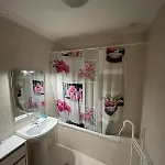 الحمام الخصوصي موفر مع المناشف والشراشف وشطافة بيديه.